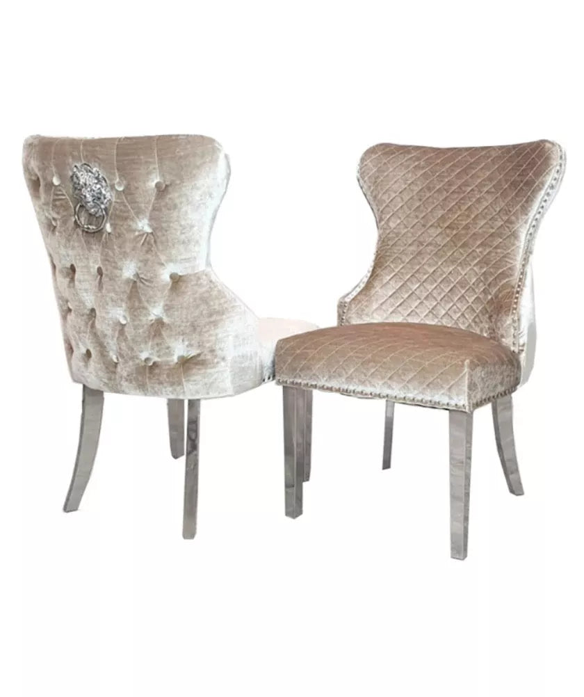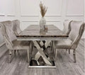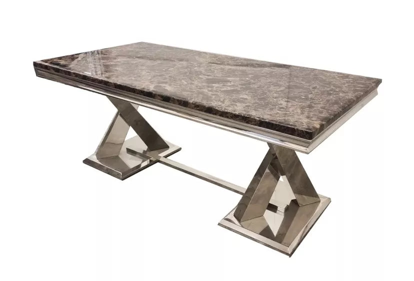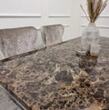 Upgrade your dining area with the stunning Ariana dining table, featuring a dark brown marble tabletop paired with luxurious champagne velvet chairs.