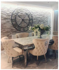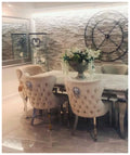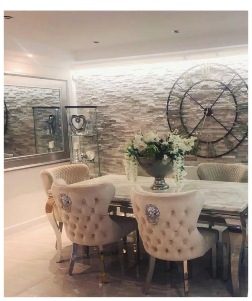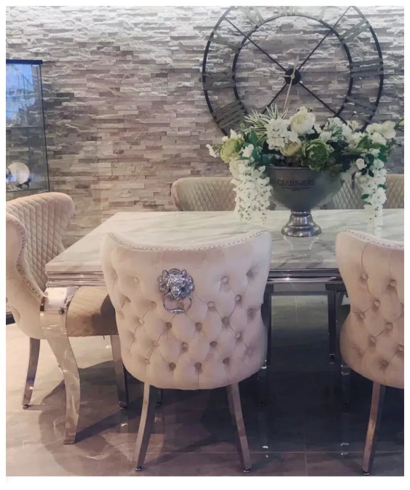 Introducing the elegant Cambridge dining table, featuring a cream marble top paired perfectly with our premium cream Valentino chairs. This set is designed to bring luxury and sophistication to any modern dining space.
