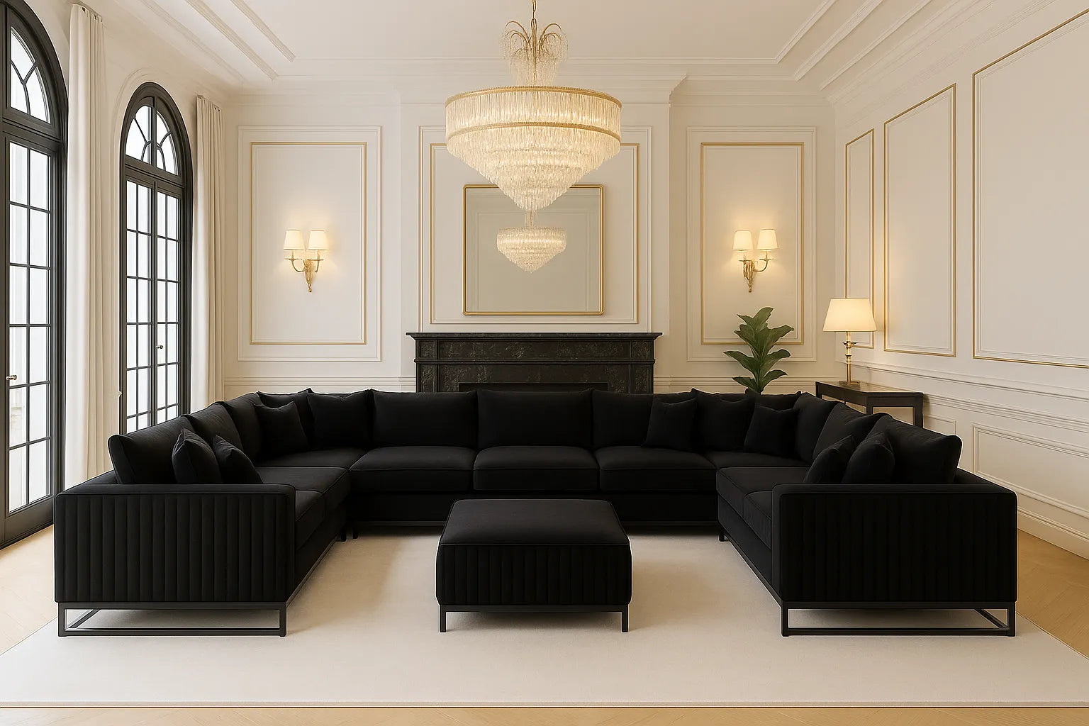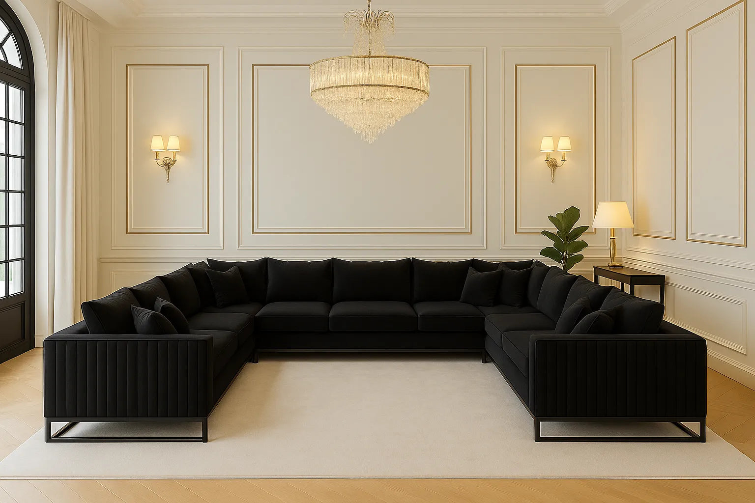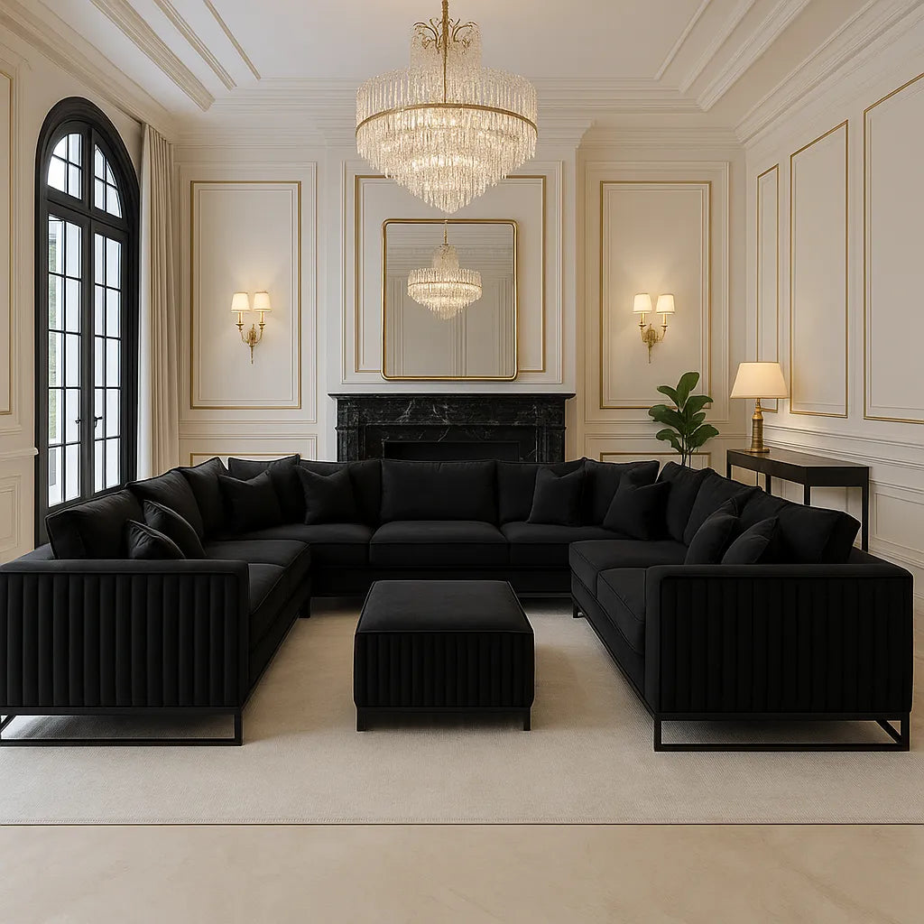 Upgrade your home with the Monaco Luxury U-Shape Sofa, designed to transform any modern or upscale interior into a statement of elegance and comfort. Upholstered in premium soft-touch black velvet, this stunning centerpiece blends contemporary style with refined detailing, making it perfect for large living rooms, open-plan layouts, media rooms, family lounges, and show homes.
