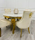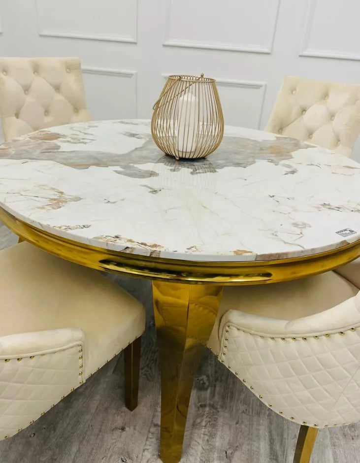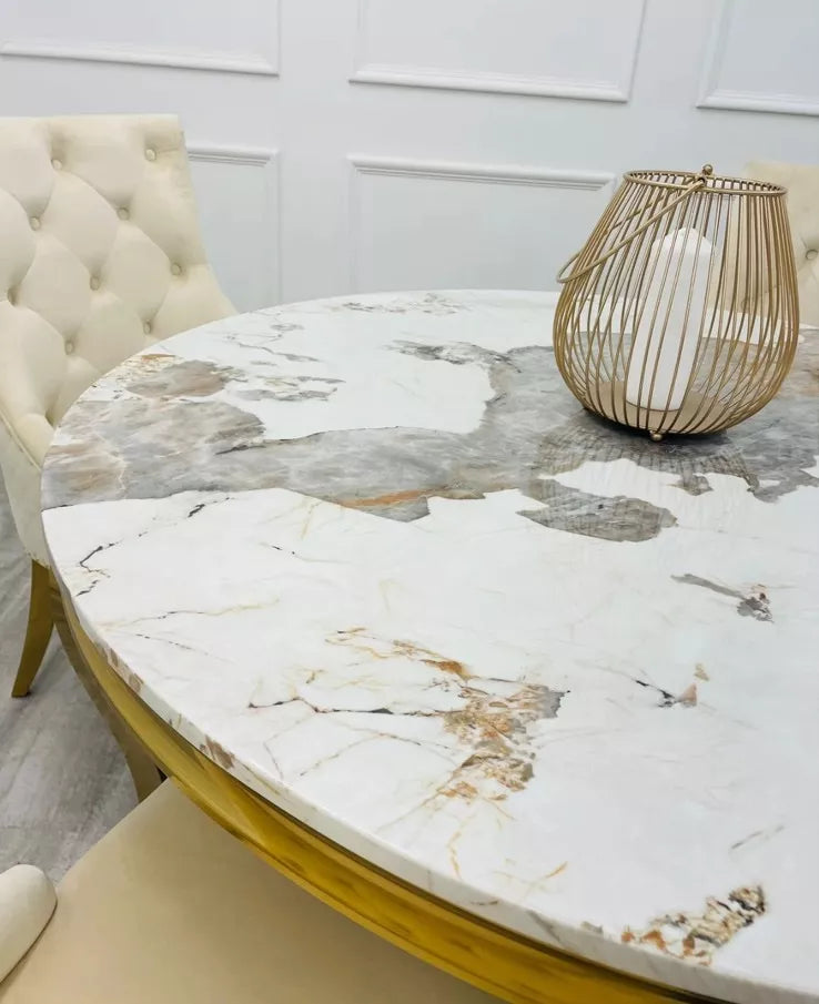 Introducing the Round Oxford dining table, featuring a luxury Pandora marble top paired with a stylish gold base, designed to enhance any modern dining space.